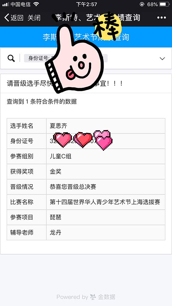 龍丹老師的琵琶學(xué)員夏思齊、陳書(shū)韻及馬瑩瑩老師的鋼琴學(xué)員杜思衡,楊知蓁老師的古箏學(xué)員俞欣妤均獲得了金獎,晉級成功征站總決賽!